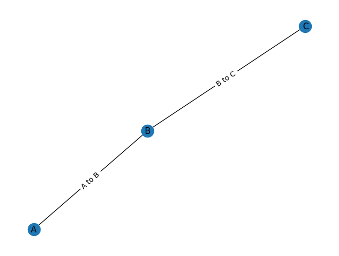 import os import tempfile import pydot from PIL import Image import rustworkx as rx from rustworkx.visualization import mpl_draw # Build first graph and visualize: graph = rx.PyGraph() node_a, node_b, node_c = graph.add_nodes_from(['A', 'B', 'C']) graph.add_edges_from([(node_a, node_b, 'A to B'), (node_b, node_c, 'B to C')]) mpl_draw(graph, with_labels=True, labels=str, edge_labels=str)