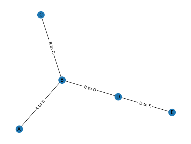 other_graphontographnode_map = {node_b: (node_d, 'B to D')} graph.compose(other_graph, node_map) mpl_draw(graph, with_labels=True, labels=str, edge_labels=str)