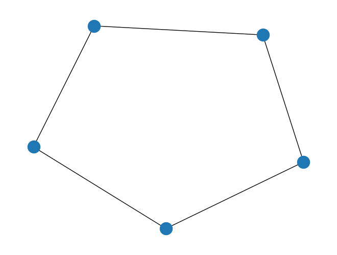 import rustworkx.generators from rustworkx.visualization import mpl_draw graph = rustworkx.generators.cycle_graph(5) mpl_draw(graph)