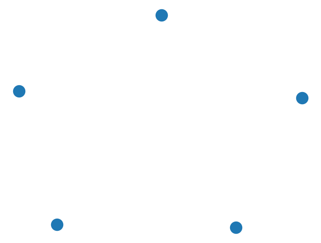 import rustworkx.generators from rustworkx.visualization import mpl_draw graph = rustworkx.generators.empty_graph(5) mpl_draw(graph)